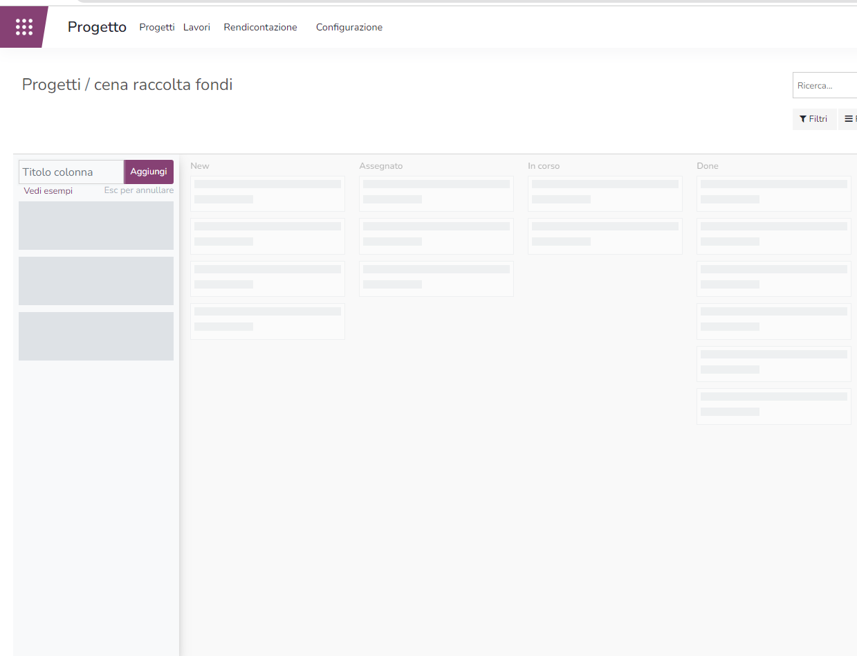 Dovrai poi creare le colonne del tuo progetto: essere serviranno come riferimento rispetto all'andamento di ogni singola attività. Il sistema ti suggerisce di inserire "new, assegnato, in corso e done", ma potrai personalizzare lo stato di ogni tuo progetto a seconda delle sue caratteristiche.