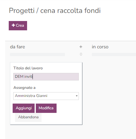 A questo punto puoi iniziare a creare le varie attività di cui si compone il tuo progetto. A esempio per una campagna 5x1000 le attività potranno essere: piano 5x1000, media plan, idea grafica, video spot, social network, stampa volantini, ecc.