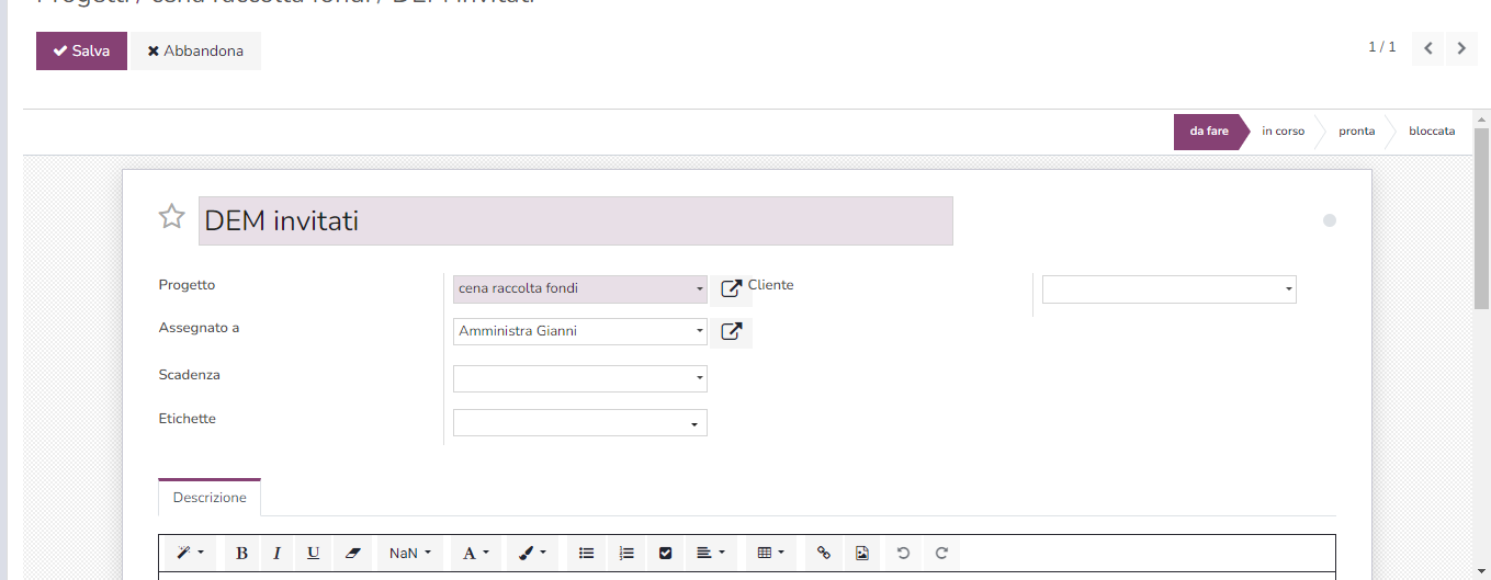 puoi appunto inserire una descrizione (campo di testo libero in fondo), una scadenza, eventuali etichette e colegare l'attività ad un cliente.