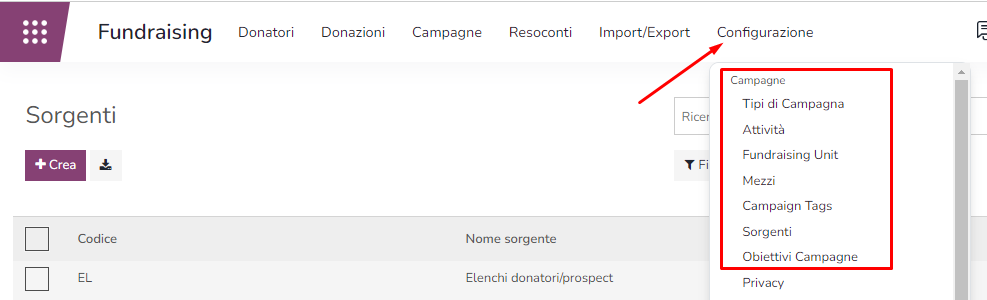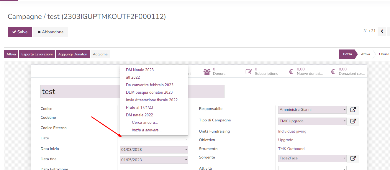 • TIPI CAMPAGNA: è un tipo di attività qualificata per mezzo dell'assegnazione degli attributi specificati nei primi tre punti successivi: Esempio "unità di fundraising (es: individui) + obiettivo (es: Upgrade) + strumento (es: mailing)