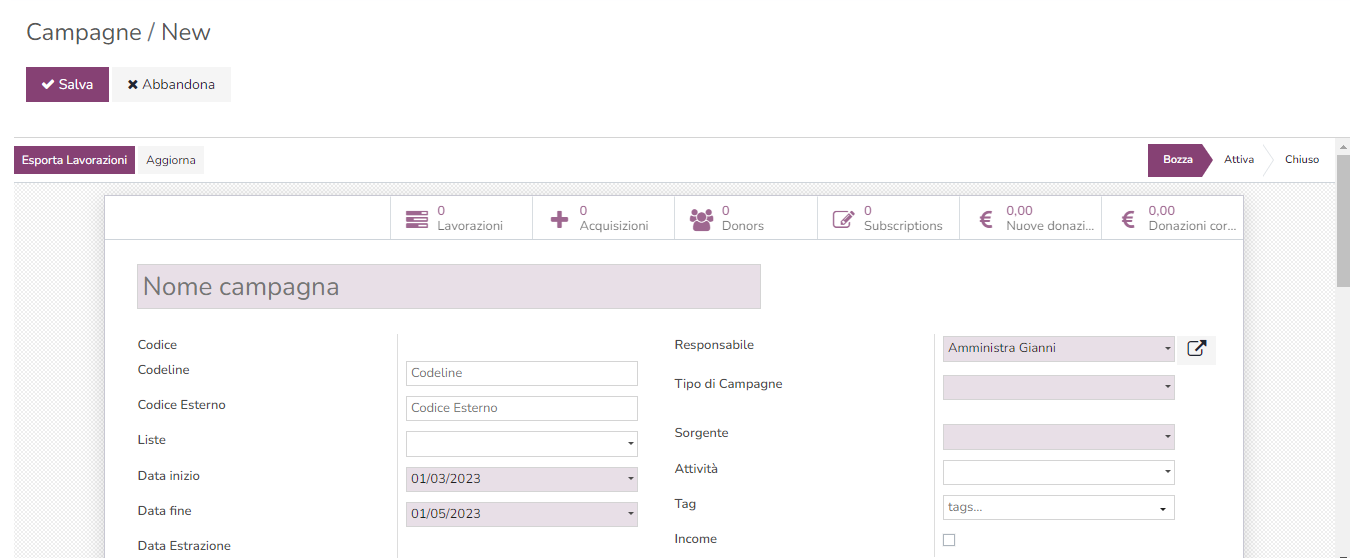 La campagna può coinvolgere anagrafiche già presenti nel tuo database oppure essere creata per anagrafiche che importerai da altri canali.