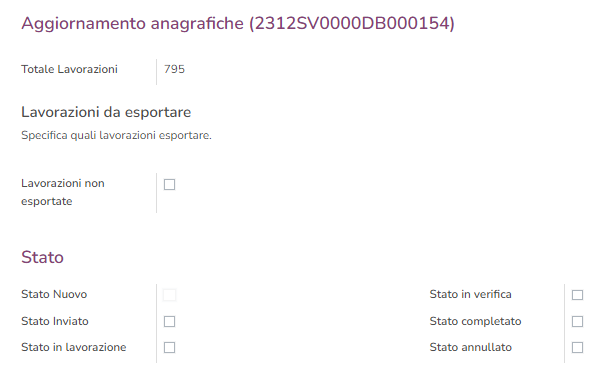 Di default Dnd esporta le lavorazioni in stato Nuovo che non sono state ancora esportate, ma i flag disponibili permettono di decidere quali lavorazioni esportare, in base allo stato in cui si trovano e decidendo se prendere in considerazione tutte le lavorazioni o solo quelle che non sono ancora state mai esportate.