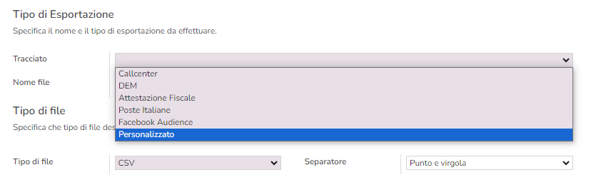 F) "Personalizzato" è possibile creare un tracciato personalizzato, nel menu Configurazione si trova la voce "Campaign Exports Layout" a cui è dedicata una sezione a parte.