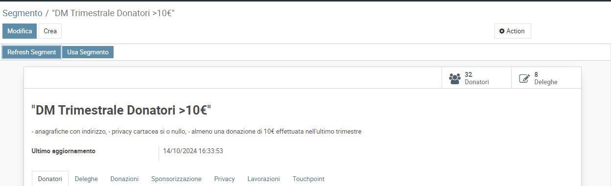 Il Segmento che hai creato da ora sarà sempre operativo nel tuo account Donodoo. Potrai dunque riutilizzarlo ogni volta che dovrai preparare l'estrazione di anagrafiche per la tua attività di Direct Mailing ricorrente.