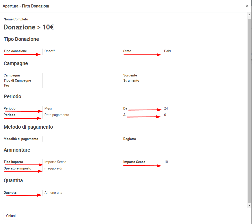 A questo punto ti si aprirà una nuova schermata in cui puoi inserire i criteri per aggiungere al segmento tutti i donatori che negli ultimi 24 mesi (o nel parametro da te definito) hanno effettuato almeno una donazione di importo secco da almeno 10 euro andata a buon fine.