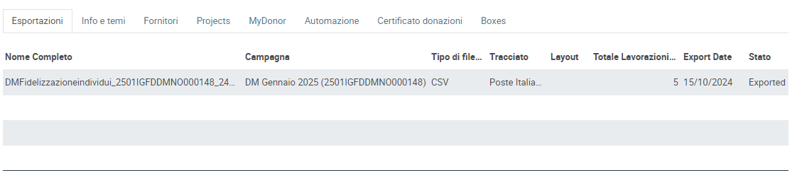 Una volta esportate le lavorazioni le ritroverai in fondo alla scheda della campagna nel tab esportazioni