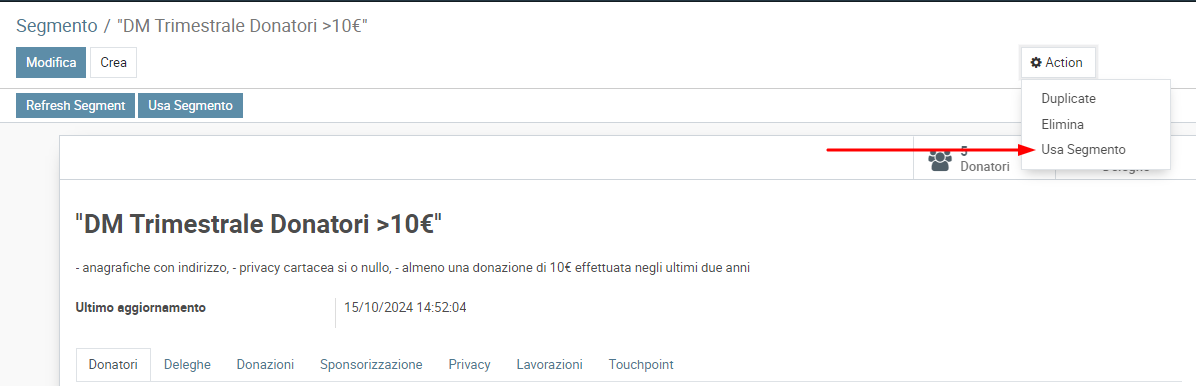 Il passaggio di creazione di un nuovo segmento per il Direct Mailing deve essere effettuato solo la prima volta. Grazie alle funzionalità di Donodoo Fundraising potrai riutilizzare questo segmento per tutte le liste e le campagne per l'attività di Direct Mailing ricorrente della tua organizzazioni.