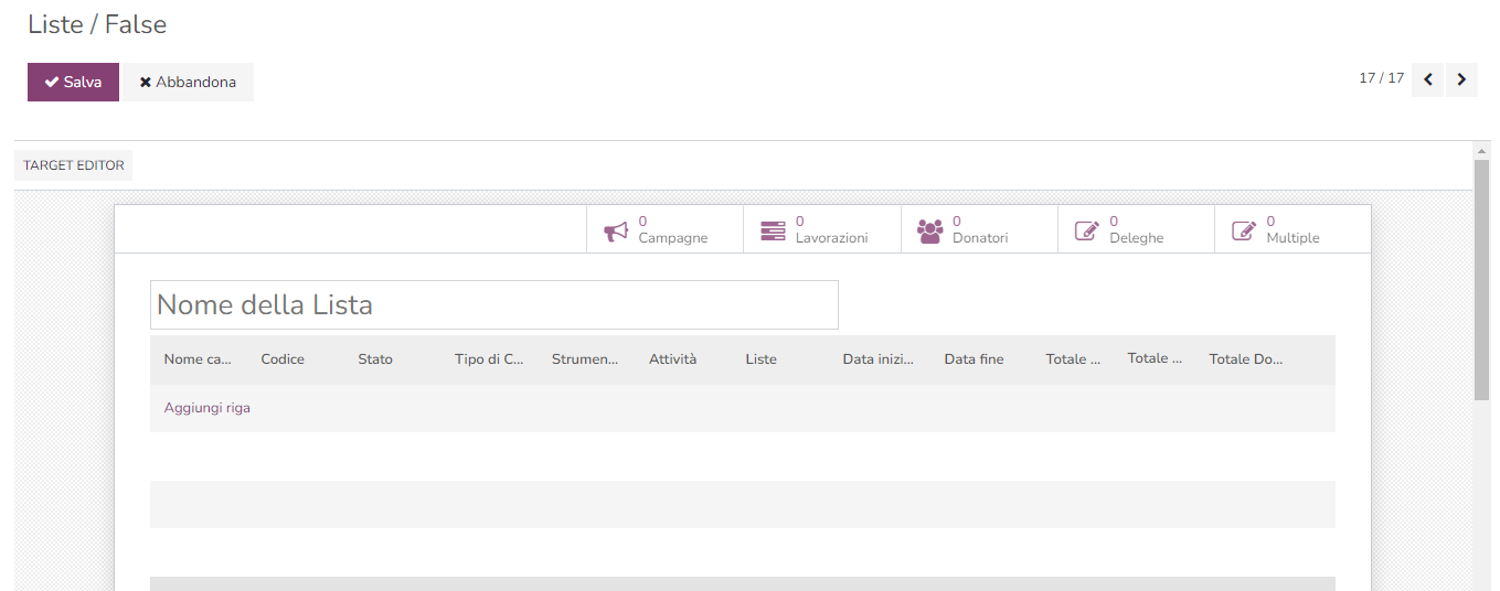 dalla schermata della campagna campo liste inserisci il nome della lista di riferimento - Dalla lista> TARGET EDITOR