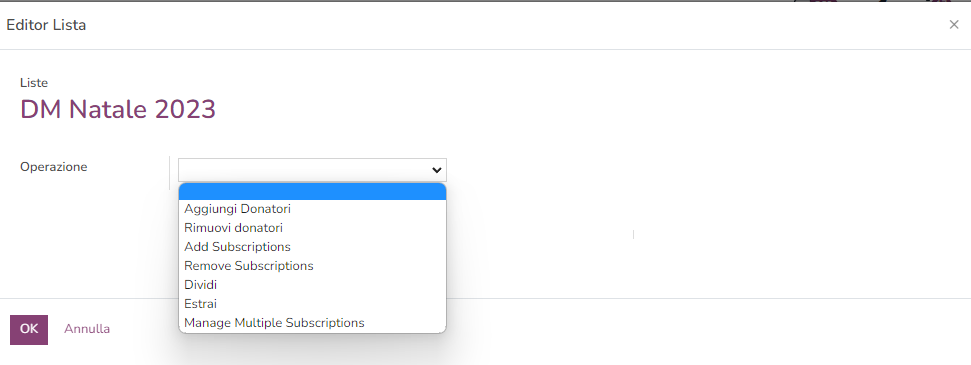 ATTENZIONE: non usare il comando "elimina" nè con le liste e nememno con i donatori altrimneti rischi di perdere anagrafiche
