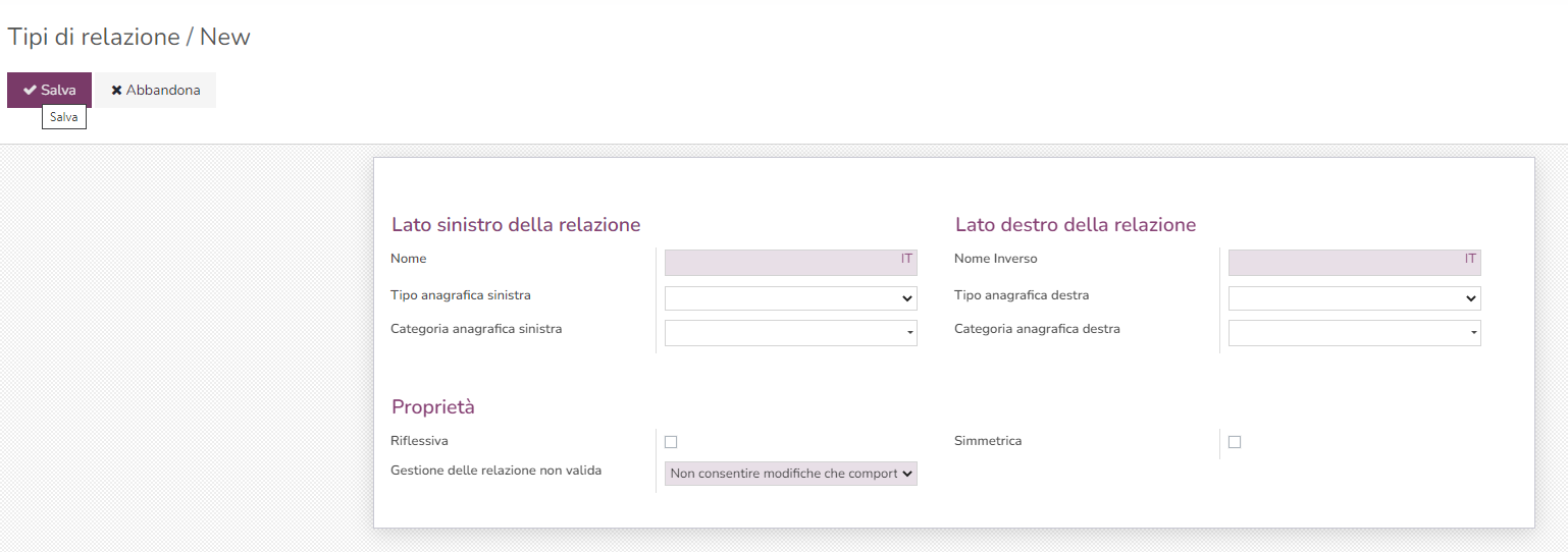 - Tipo anagrafica sinistra/destra: scegliendo tra Organizzazione/Persona, si decide tra quali tipologie di anagrafiche potrà essere stabilita questa relazione; nel caso quindi dell'esempio Genitore/Figlio entrambi i tipi di anagrafica dovranno essere Persona; nel caso di una relazione di lavoro, da un lato indichiamo Organizzazione e dall'altro Persona