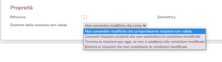 - Gestione della relazione non valida: da questa voce decidi come deve essere gestita la relazione in caso di modifiche successive alle anagrafiche messe in relazione che rendono la relazione stessa non più valida perché non vengono più soddisfatti i parametri indicati, a scelta tra: