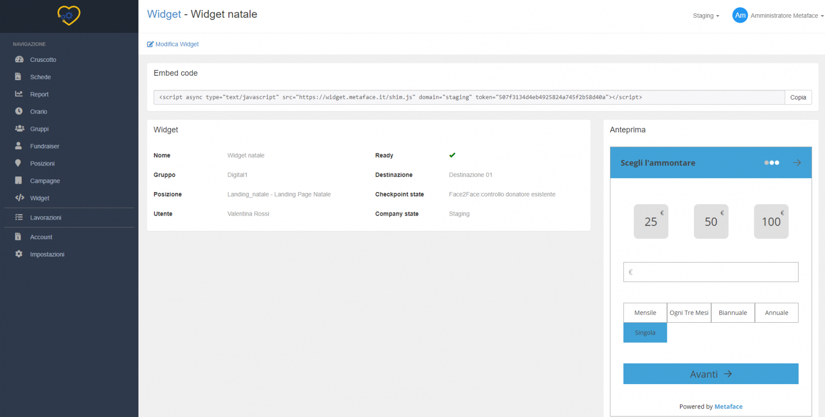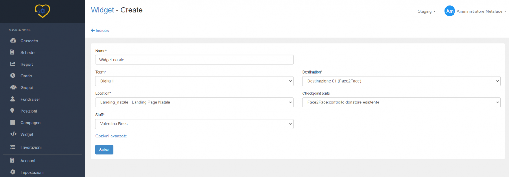 Prima di aggiungere un widget, è consigliato avere già un progetto dedicato dove indirizzare le schede raccolte online, per non confonderle con quelle raccolte per strada dai dialogatori; può essere un solo progetto dove indirizzare le schede in arrivo da tutti i widget creati o più progetti corrispondenti a ciascun widget.