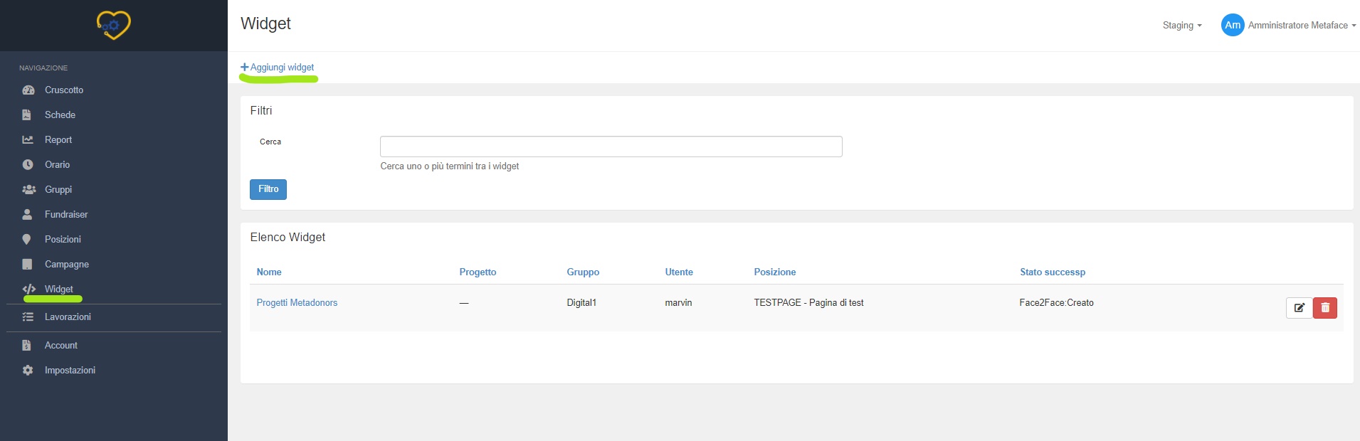 Cliccate sulla voce "Widget" nel menu a sinistra del vostro Metaface per visualizzare i widget già creati.