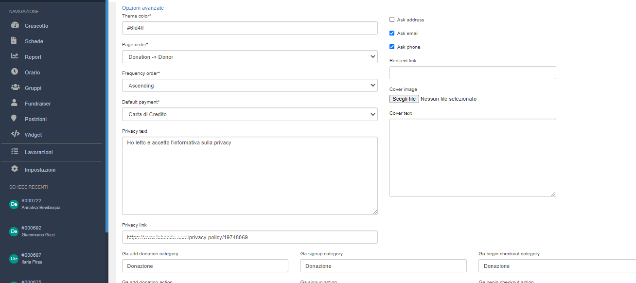 - PRIVACY TEXT: inserite il testo che il donatore leggerà prima di procedere con l'invio dei dati "Ho letto l'informativa..."
