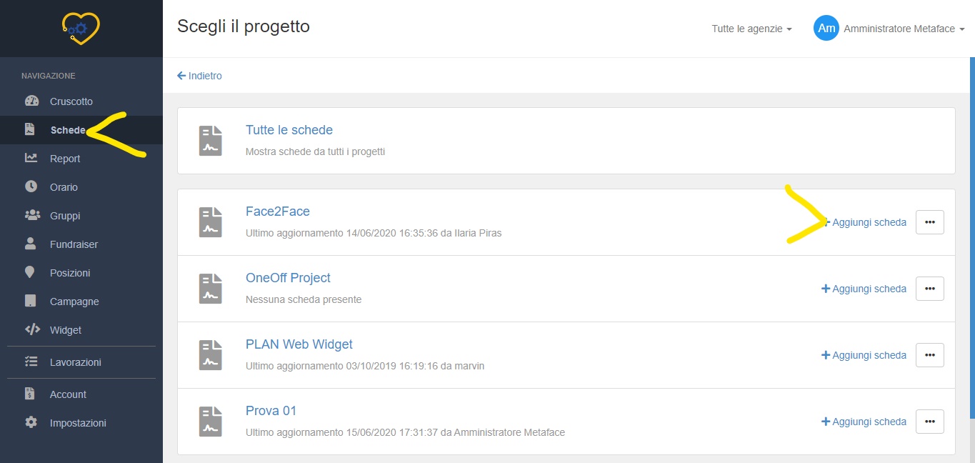 In alternativa, cliccate sul nome del progetto e una volta all'interno trovate nel menu in alto la voce "Aggiungi scheda"