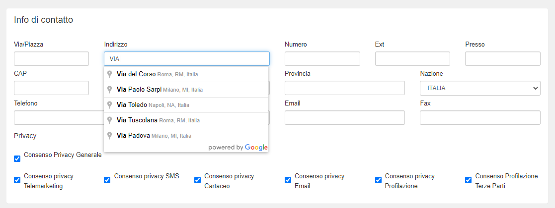 Particolarità di questo blocco è che - durante la digitazione - il campo indirizzo si popola con gli indirizzi presi dai sistemi di Google Map, in modo da rendere l’inserimento più semplice e fare meno errori.