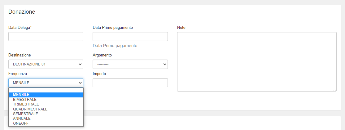 Se impostati nel progetto, nel campo Importo saranno visualizzate delle cifre suggerite standard per ogni frequenza selezionata, per rendere la compilazione più veloce.