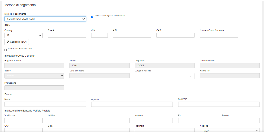 Passiamo al blocco delle informazioni di contatto del Donatore: