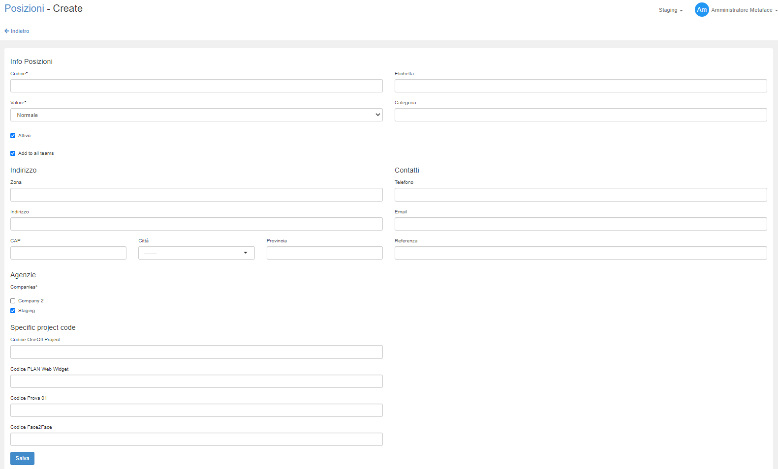 La creazione di una nuova posizione comporta la compilazione dei seguenti campi: