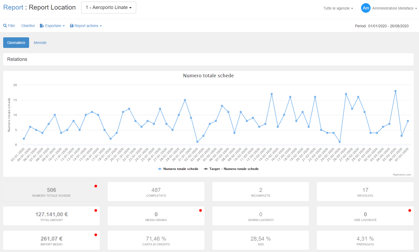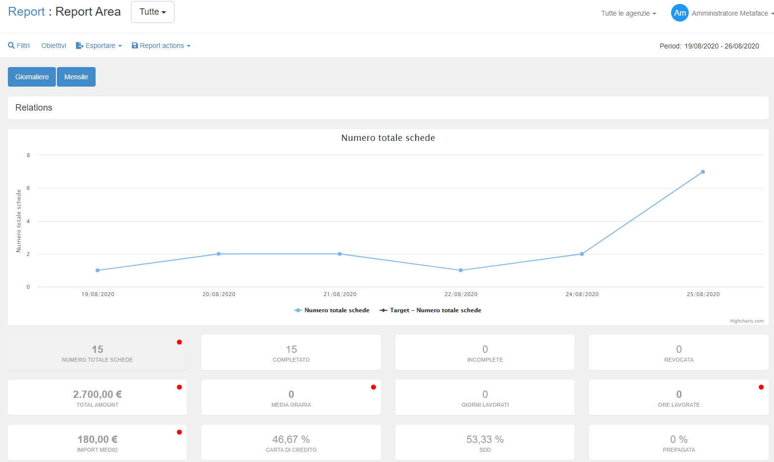 Reportistica relativa alle aree mappate su Metaface: potete selezionarle tutte o singolarmente, dal menu a tendina.