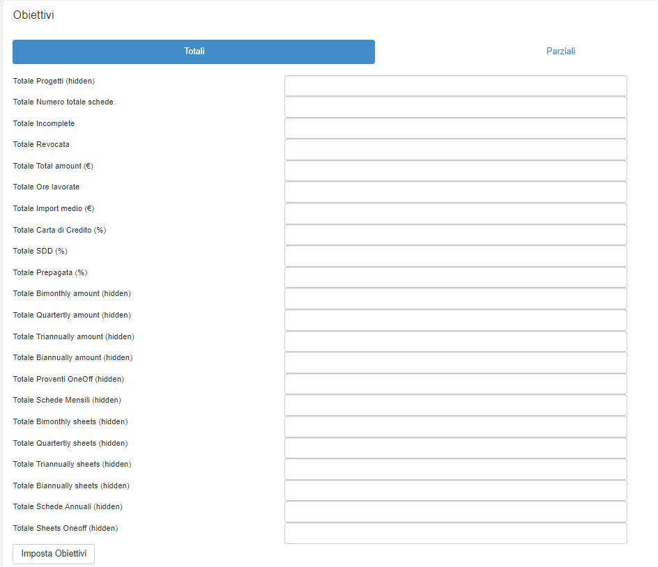- OBIETTIVI: potete impostare degli obiettivi (totali o parziali) su una o più KPI; in questo modo, nel quadratino della singola KPI, vedrete oltre al valore assoluto, anche la percentuale di differenza dall'obiettivo impostato.