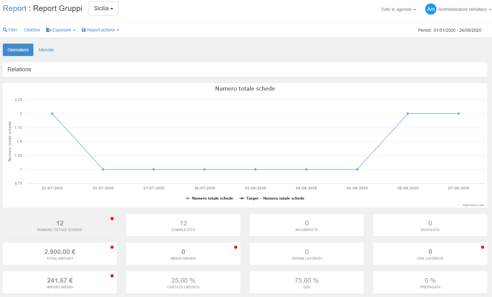 Reportistica relativa alle aree mappate su Metaface: potete selezionarle tutte o singolarmente, dal menu a tendina.
