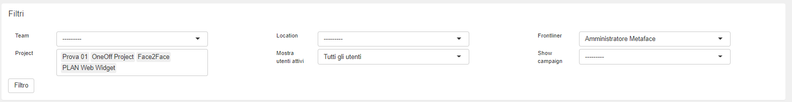 - FILTRI: per ogni tipo di report sono disponibili filtri diversi che vi permettono di affinare i risultati del report (ad esempio, nel frontliner report, potete guardare solo gli utenti attivi, escludendo i dati relativi ai non attivi)