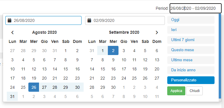 - CALENDARIO: nella parte destra è possibile scegliere il periodo da controllare, impostandolo sia scegliendo le date, sia scegliendo le diverse opzioni come Ultimo mese, Da inizio anno ecc...
