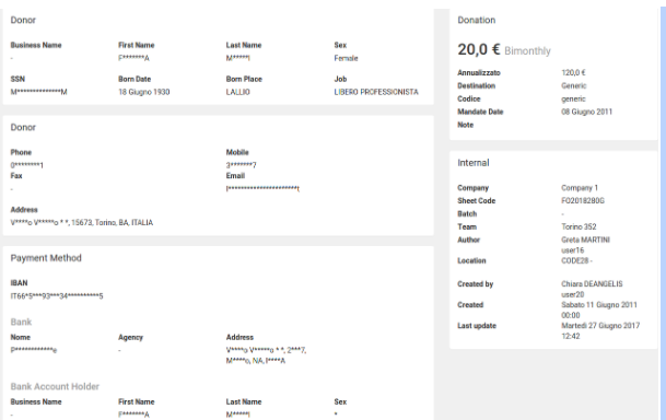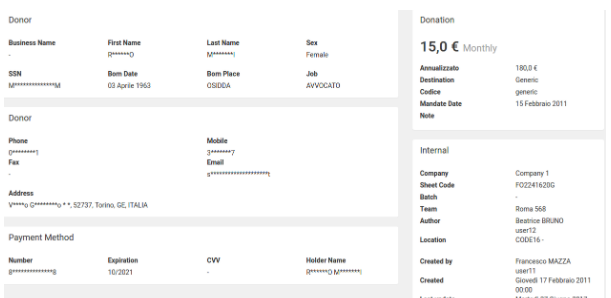 Attraverso la funzione di “Anonimizzazione” dei dati personali delle schede, Metaface permette di sostituire i caratteri centrali del campo, che si intende anonimizzare, con una serie di asterischi **********, mantenendo il carattere iniziale e quello finale, al fine di ridurre l’esposizione al rischio dei dati dei donatori.