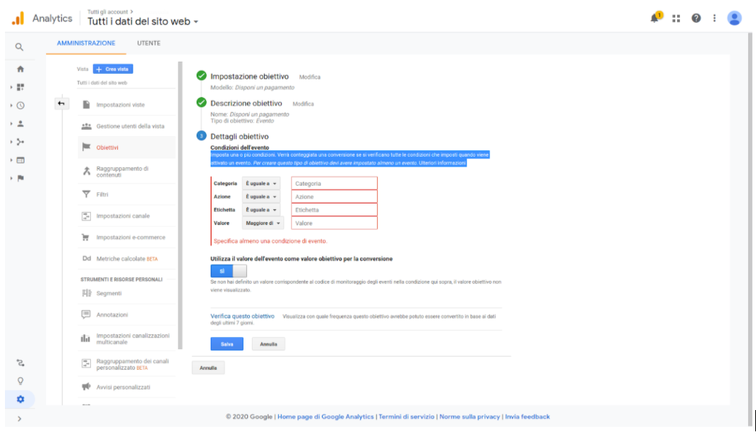 Da qui è possibile definire un evento come una conversione da registrare, in base ai parametri impostati nell’evento stesso.